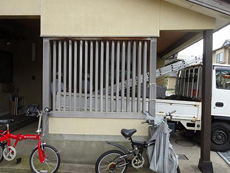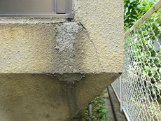 | 塗装前の建物全景です。外壁にヒビ割れが何箇所か確認出来ます。雨水の侵入が 心配されます。 | 塗装前の建物全景です。外壁の褪色も進行しており、耐久性・防水性はかなり低下しています。 | 玄関格子です。劣化により褪色が進み、このままでは雨水により腐食していく可能性もあります。 |