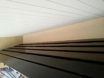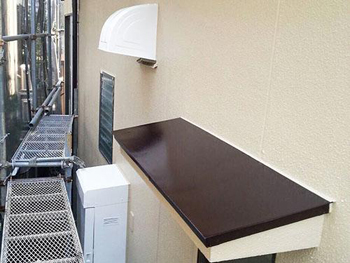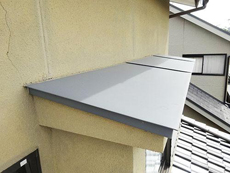 | 玄関の軒天です。玄関軒天には特に傷みはありません。外観と合わせての塗替えをします。 | サッシ廻りです。外壁塗膜の劣化により、防水性が弱まったため、雨水の浸透が心配される状況でした。 | 出窓小屋根です。経年劣化により褪色が進んでいます。 |