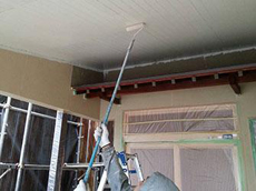 | 付帯部工事です。玄関軒天の塗装です。 | 付帯部工事です。玄関軒天の塗装です。 | 付帯部工事です。破風板塗装(1回目)です。 |