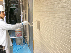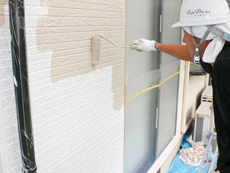 | 外壁工事の様子です。サイディング張りを行います。 | 外壁工事の様子です。下塗り作業(1回目)を行います。 | 外壁工事の様子です。上塗り作業(1回目)を行います。 |