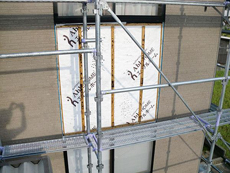 | 外壁工事の様子です。一部張替えで窓廻り防水処理を行います。 | 外壁工事の様子です。下時処理を行います。 | 外壁工事の様子です。サイディング張りを行います。 |