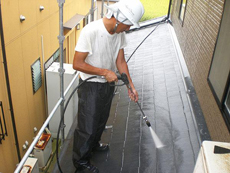 | 屋根工事の様子です。上塗り作業(1回目)を行います。 | 屋根工事の様子です。上塗り作業(2回目)を行います。 | 洗浄工事の様子です。外壁の汚れを高圧で洗い流します。 |