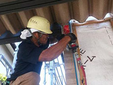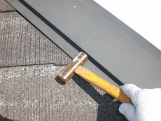 | 足場工事の様子です。足場機材の搬入と組立作業です。 | 洗浄工事の様子です。屋根の汚れを高圧で洗い流します。 | 屋根工事の様子です。浮いている釘などは、打ち込んでいきます。 |