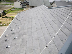 | コロニアル屋根の劣化の様子。褪色が進行し、防水効果も低下しています。素地の繊維質(石綿)も露出しています。 |