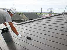 | 屋根工事の様子です。下塗り作業(1回目)を行います。 | 屋根工事の様子です。下塗り作業(2回目)を行います。 | 屋根工事の様子です。下塗り作業(3回目)を行います。 |