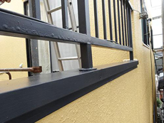 | 付帯部:鋼製手すり補修後の様子です。 | 付帯部:梁天端笠木取付けの様子です。 | 付帯部:竪樋の様子です。つなぎ部より漏水があります。 |