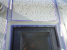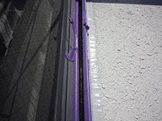 | 竪樋の様子です。 | 足場:飛散防止メッシュシート張りの様子です。足場組立完了です。 | シーリング:既設シーリング抜き取り作業の様子です。 |