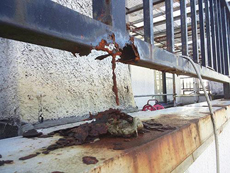 | 付帯部:鋼製手すり腐食部の様子です。 | 付帯部:補修工事腐食部の切断の様子です。 | 付帯部:鋼製手すり溶接作業の様子です。 |