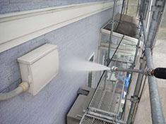 外壁を高圧洗浄していきます。コケや藻・汚れを除去する作業です。 |