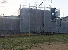 足場:足場飛散防止メッシュシート張りします。 |