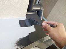 | 付帯部:板金部(雨押え)です。上塗りにファインシリコンフレッシュを使用しています。 | 付帯部:雨樋(金具)です。錆止め塗布にハイポンファインプライマーⅡを使用しています。 | 付帯部:雨樋ケレン作業です。※ケレンとは汚れや古い塗装を落とす作業のことです。 |