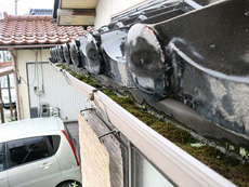 | 現場調査:目地モルタル幅(目地幅10.0mm)です。 | 現場調査:目地モルタル深さです。(目地深さ6.0mm) | 現場調査:雨樋金具に錆び確認と樋内部にコケが発生です。 |
