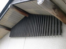 | 付帯部:雨樋の様子です。上塗り にファインシリコンフレッシュを使用しています。 | 付帯部:軒天です。上塗りにケンエースG-Ⅱを使用しています。 | 付帯部:軒天完成です。 |