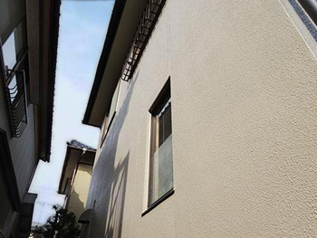 | 外壁:下塗り完了です。アンダーフィラー弾性エクセルを使用しています。 | 外壁:上塗り 1回目です。ファインシリコンフレッシュを使用しています。 | 外壁:上塗り 2回目です。ファインシリコンフレッシュを使用しています。 |