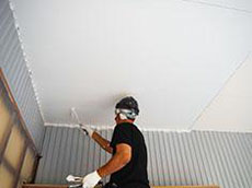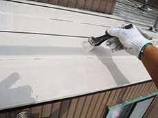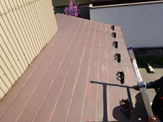 | 屋根:下屋根のケレン作業の様子です。※ケレンとはサビを落とす作業のことです。 | 屋根:下屋根錆び止め塗布の様子です。 | 屋根:下屋根 上塗り2回目の様子です。サーモアイSiを使用しています。 |