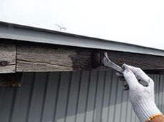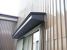 外壁鋼板や小庇板金の劣化が進んで脆くなっている状態です。補修及び塗替えが必要な状態です。 |