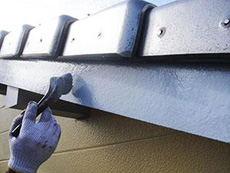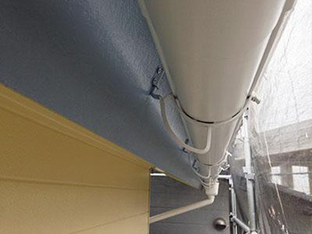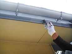| 付帯部:雨樋下塗り(錆止め)です。 | 付帯部:雨樋中・上塗りの様子です。 | 付帯部:破風板塗装作業です。 |