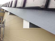 | 付帯部:破風板塗装作業の様子です。 | 付帯部:破風板・雨押さえ板金塗装完了です。 |