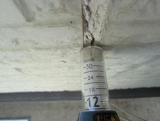 | 現場調査:手にチョークの様に白い粉が付着しています。これはチョーキング現象といい外壁の塗膜が劣化して剥がれている証拠です。 | 現場調査:コーキングの硬度を計測します。 | 足場:足場機材の設置作業の様子です。 |
