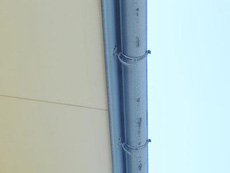 | 上部外壁:中・上塗り作業の様子です。アステック(25-85F)を使用しています。 | 外壁ボーダー:下塗り(錆止め)の様子です。 | 外壁ボーダー:中・上塗りの様子です。アステック EC-2000Fエレクトリックブルー(9014)を使用しています。 |