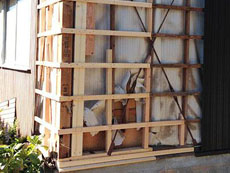 外壁:新たに柱の両際に補強をし、部材と土台も一部交換しました。 |