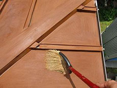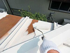 | 下屋根:下塗り(錆び止め)の様子です。ニッペ ハイポンファインプライマーⅡを使用しています。 |