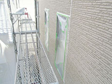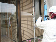 | 外壁:養生の様子です。 | 外壁:高圧洗浄の様子です。 | 外壁:タイル部分のクリヤー塗装1回目です。 (ニッペUVプロテクトクリヤー) |