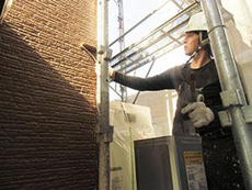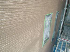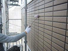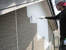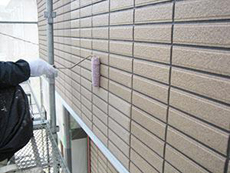 | 外壁:タイル部分のクリヤー塗装2回目です。 | 外壁:下塗りです。(ニッペパーフェクトサーフ) | 外壁:中塗りです。(ニッペファインシリコンフレッシュ) |