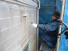 外壁:上塗り塗装作業中です。 |
