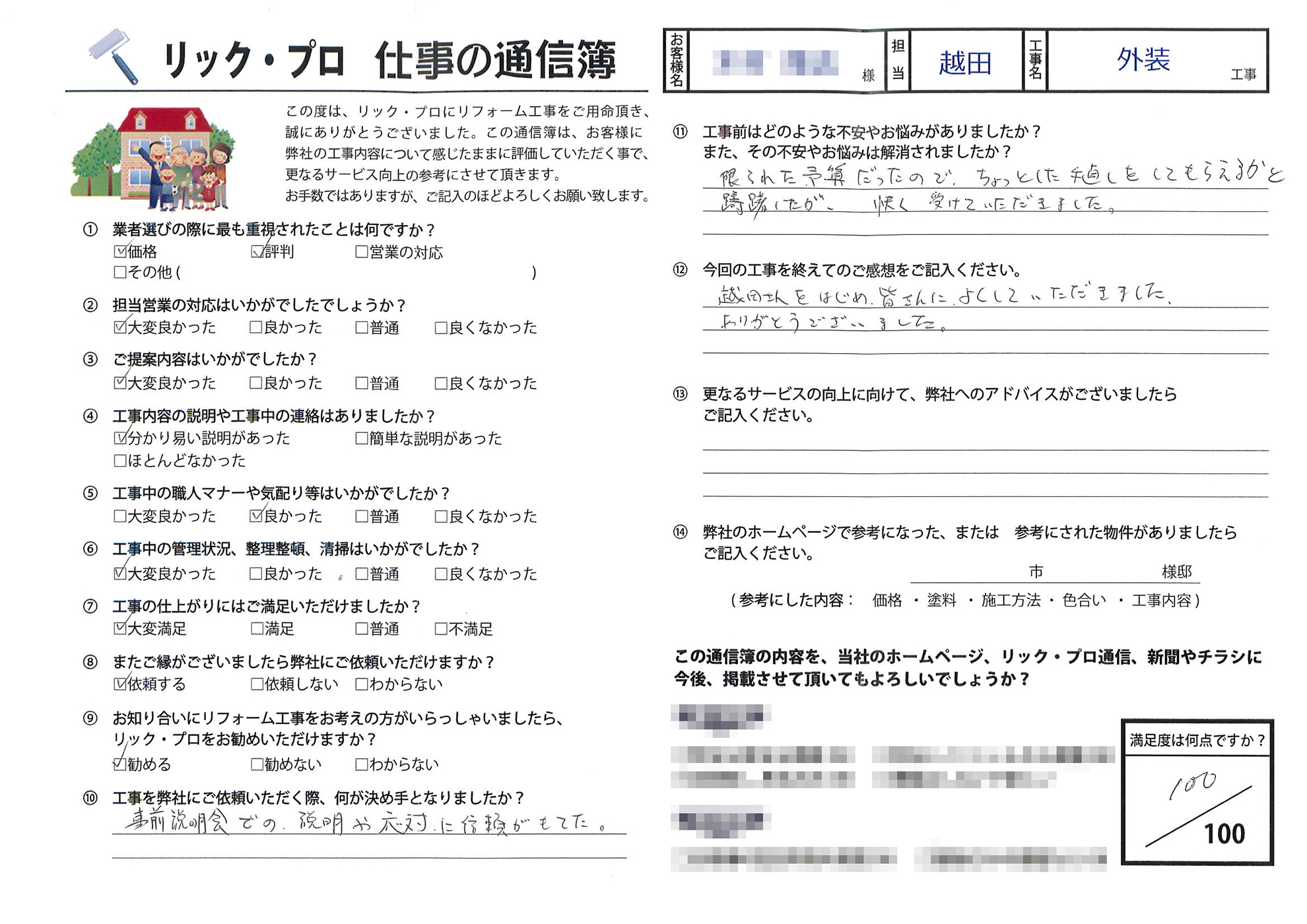 お客様からのご感想事前説明会での説明や応対に信頼がもてた。限られた予算だったので、ちょっとした手直しをしてもらえるかと躊躇したが、快く受けていただきました。 越田さんをはじめ、皆さんによくしていただきました。ありがとうございました。 |