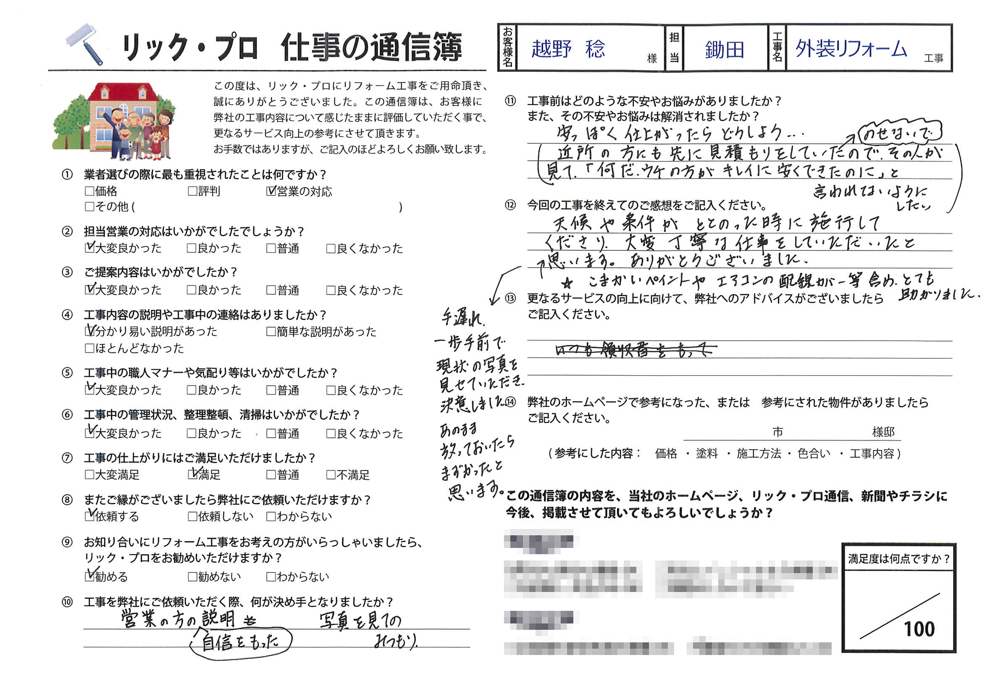 - 白山市宮保町 屋根・外壁塗装工事 越野様の声