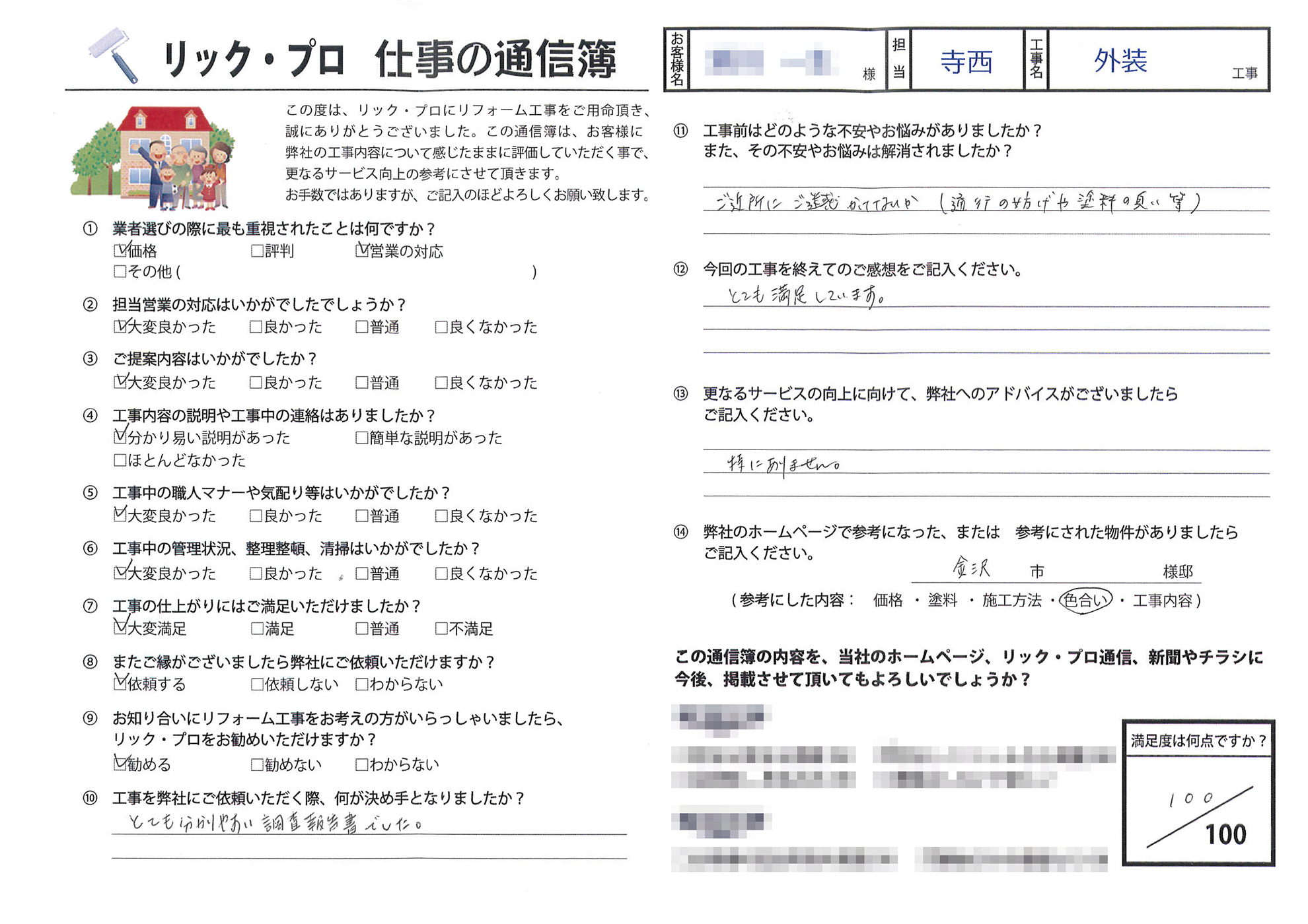 金沢市大浦町 外壁塗装・一部張り替え工事 S様の声