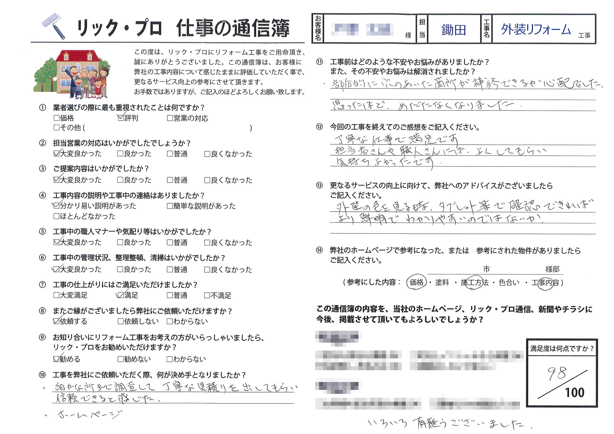 金沢市新保本 屋根・外壁塗装工事のお客様の声